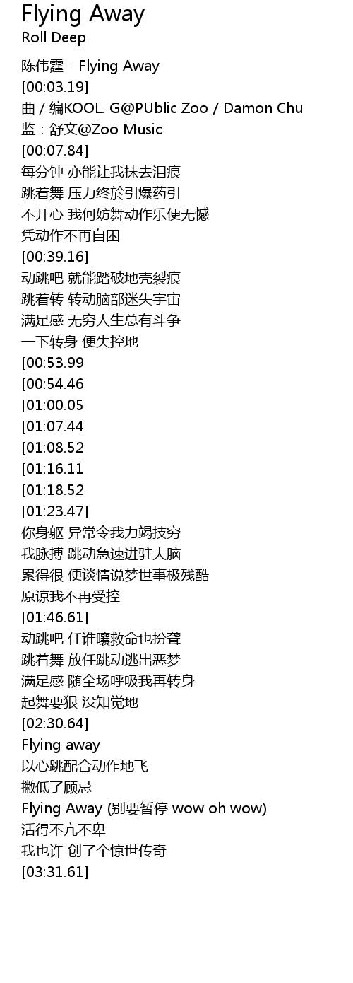 | [03:15.45] | Flying Away bie yao zan ting wow oh wow |