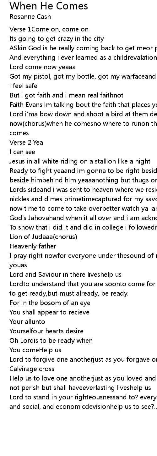 Lord i'ma bow down and shoot a bird at them devils cause its onnowit's on now(chorus)when he comesno where to runon that day,the world gonna paywhen he comes |