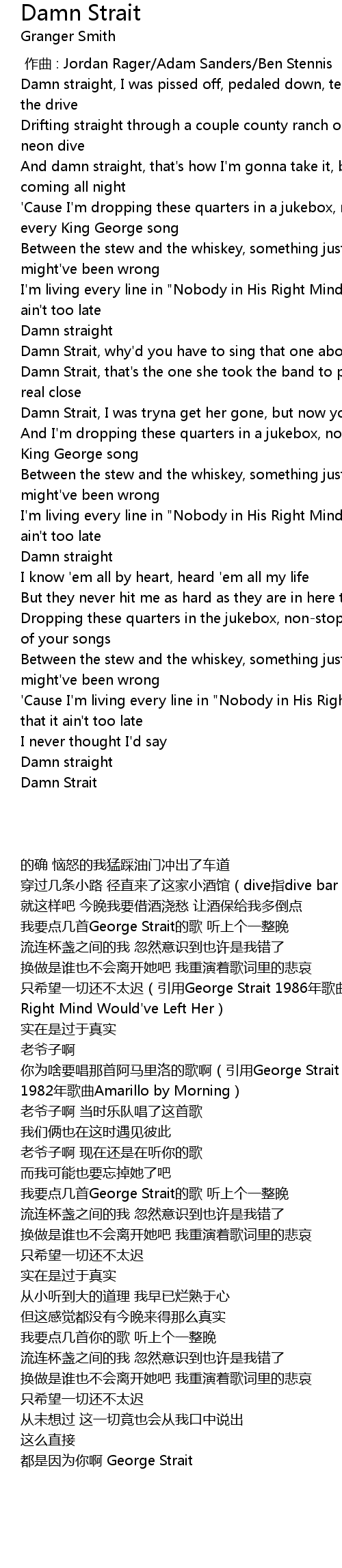 | [00:38.188] | 换做是谁也不会离开她吧 我重演着歌词里的悲哀 只希望一切还不太迟(引用George Strait 1986年歌曲Nobody in His Right Mind Would've Left Her) |