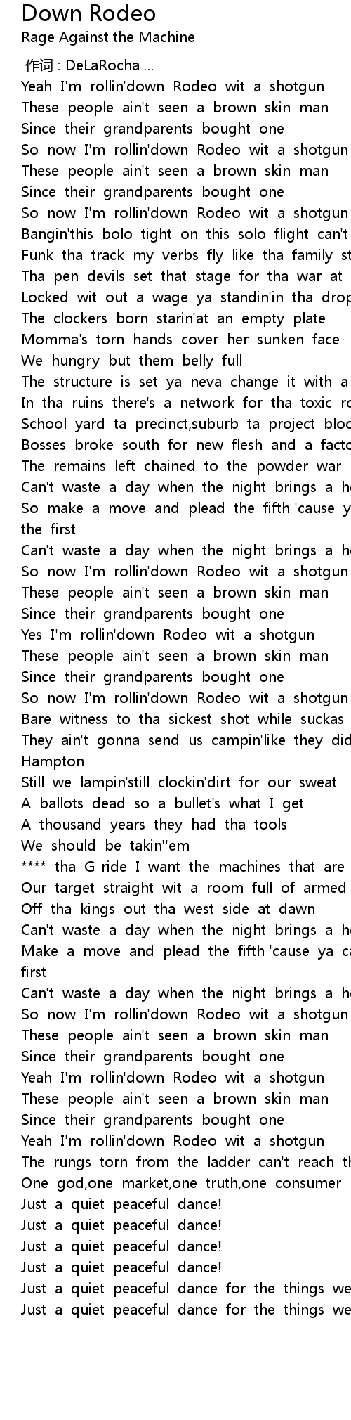| [00:30.353] | Yeah I' m rollin' down Rodeo wit a shotgun |