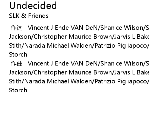 | [00:00.000] | 作词 : Vincent J Ende VAN DeN/Shanice Wilson/Sylvester Jr Jackson/Christopher Maurice Brown/Jarvis L Baker/ANtonio Eugene William Stith/Narada Michael Walden/Patrizio Pigliapoco/Felicia Ferraro/Scott Spencer Storch |