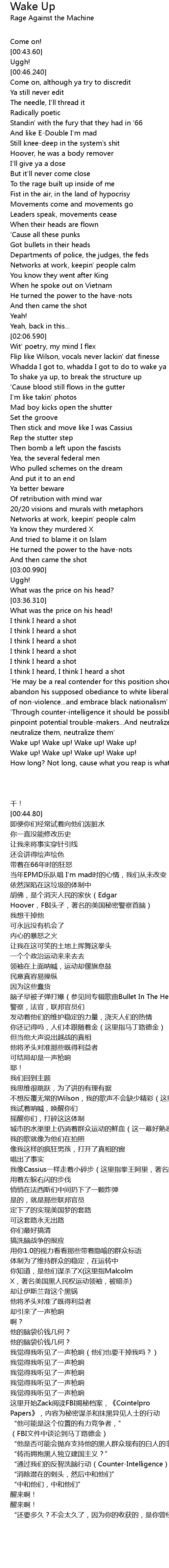 | [02:46.350] | 你知道,是他们谋杀了X(这里指Malcolm X,著名美国黑人民权运动领袖,被暗杀) |