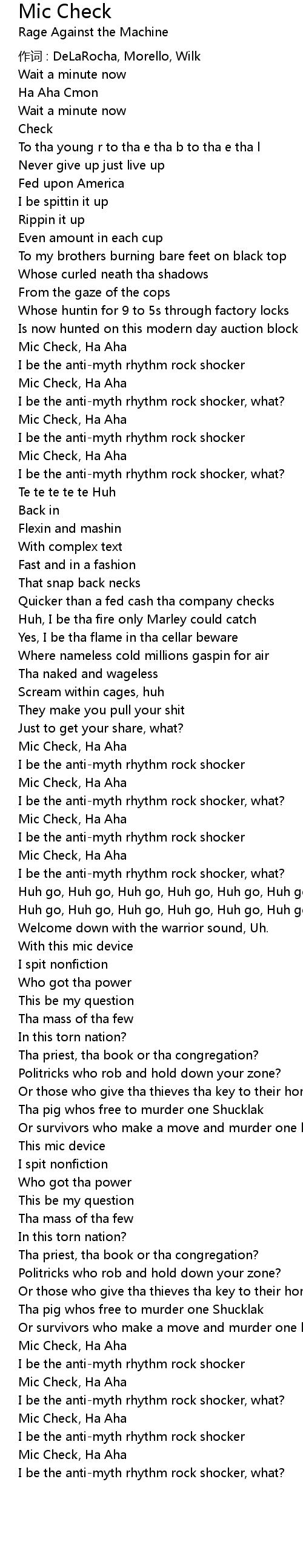 | 作词 : DeLaRocha, Morello, Wilk | |