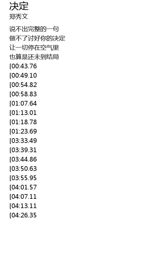 | [04:29.62][03:33.49][01:33.91] | 我的爱 由你决定 |