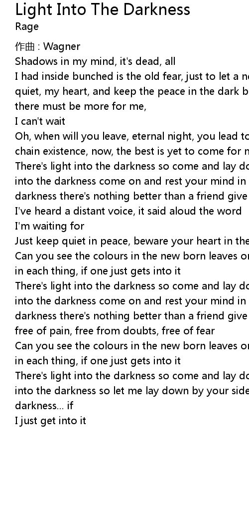 | There' s light into the darkness so come and lay down by my side there' s light into the darkness come on and rest your mind in my arms let me enlight your darkness there' s nothing better than a friend give light into my darkness... | |