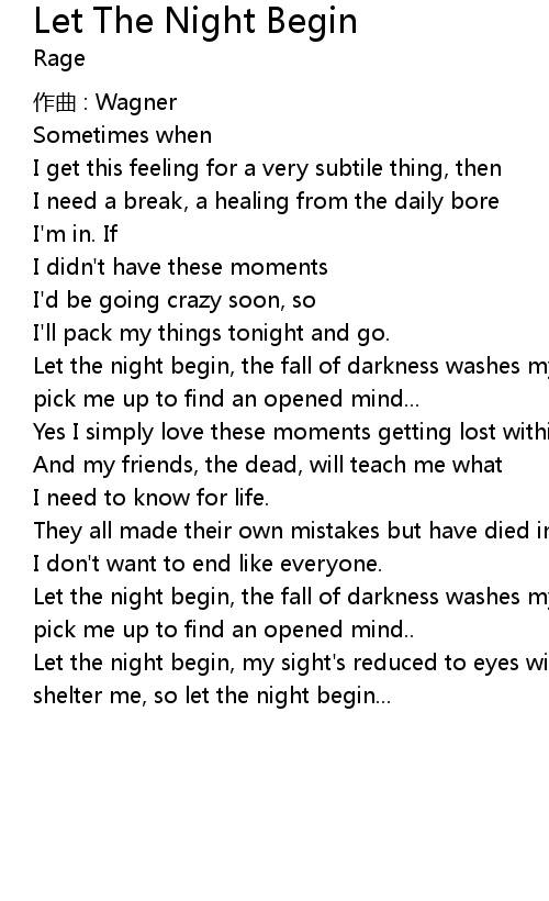 | Let the night begin, my sight' s reduced to eyes within, the light of moon will shelter me, so let the night begin... |