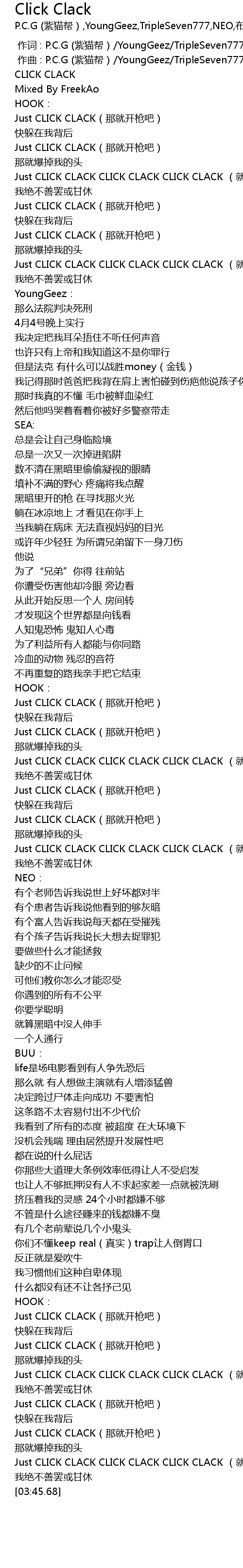 | [03:34.28] | Just CLICK CLACK na jiu kai qiang ba |