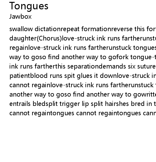 | swallow dictationrepeat formationreverse this fortunebring back tongue-tooth daughter(Chorus)love-struck ink runs fartherunstuck tongues cannot regainlove-struck ink runs fartherunstuck tongues cannot regainso find another way to goso find another way to gofork tongue-tinepierce armorprint love-struck ink runs fartherthis separationdemands six sutures therefrom tongues to patientblood runs spit glues it downlove-struck ink runs fartherunstuck tongues cannot regainlove-struck ink runs fartherunstuck tongues cannot regainso find another way to goso find another way to gowritten in fracturein leaves of entrails bledsplit trigger lip split hairshes bred in tongues (tongues)tongues cannot regaintongues cannot regaintongues cannot regaintongues cannot regain |