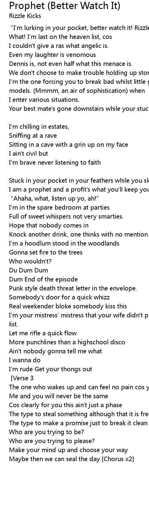 [Verse 1] "I'm lurking in your pocket, better watch it! Rizzle Kicks, HA!" |