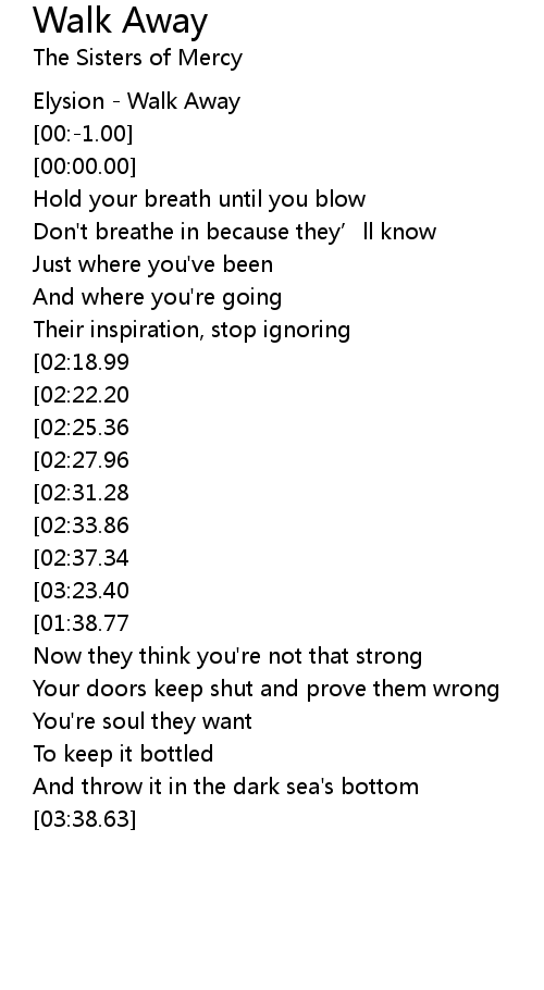 | [03:26.38][03:23.40][03:20.24][02:41.04][01:35.72] | Just walk away |