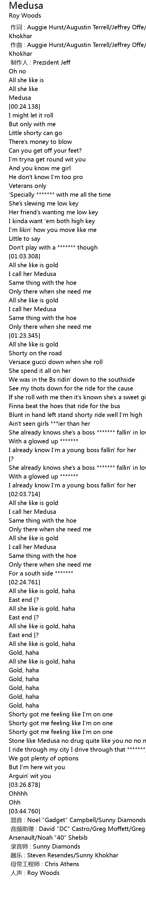 | [03:06.410] | Stone like Medusa no drug quite like you no no no one |