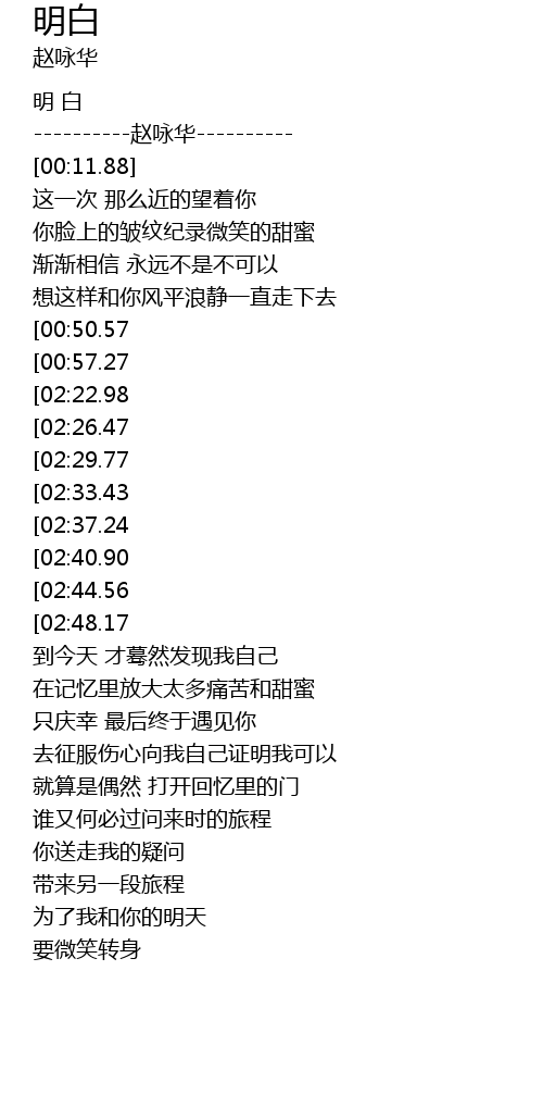 | [03:20.15][02:22.98][01:04.05] | 爱过才明白谁懂得爱 |