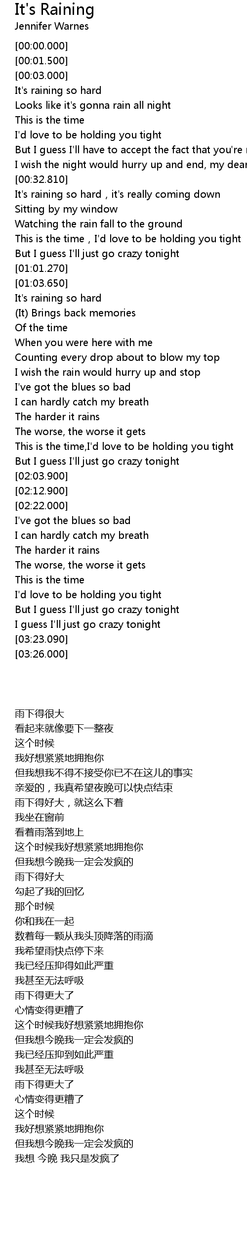 | [00:33.040] | It' s raining so hard, it' s really coming down |
