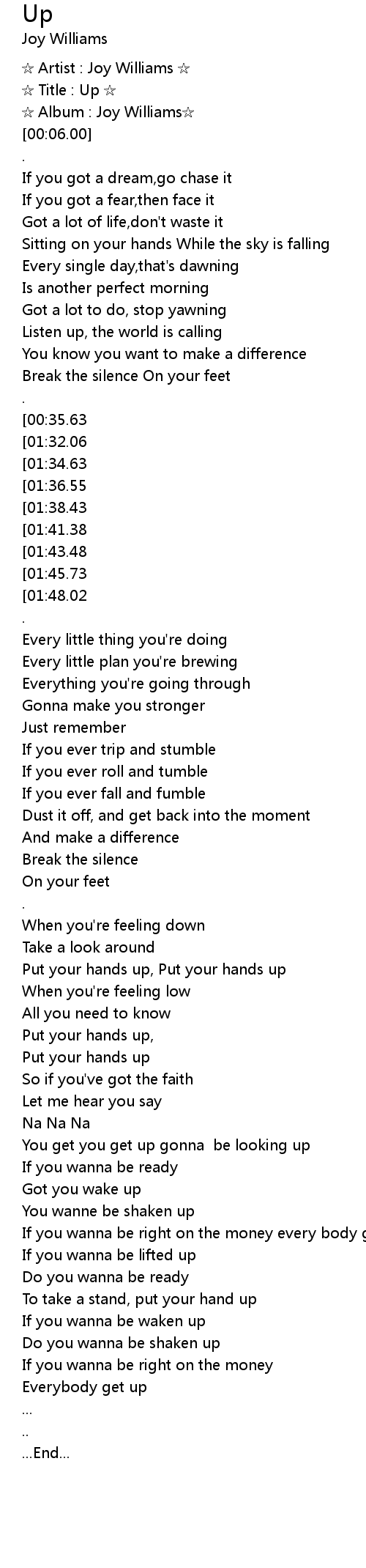 | [02:35.88][01:32.06][00:37.34] | If you wanna be lifted up |