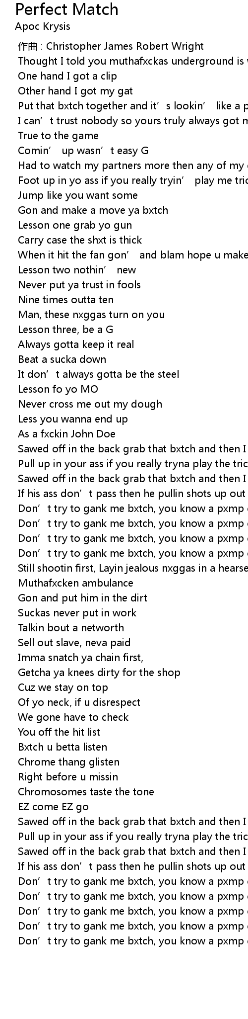 | [00:17.945] | Put that bxtch together and it’s lookin’ like a perfect match |
