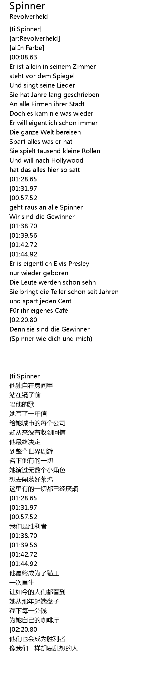 | [00:02.72][ti:Spinner][00:08.63][ar:Revolverheld][00:12.64][al:In Farbe] | |