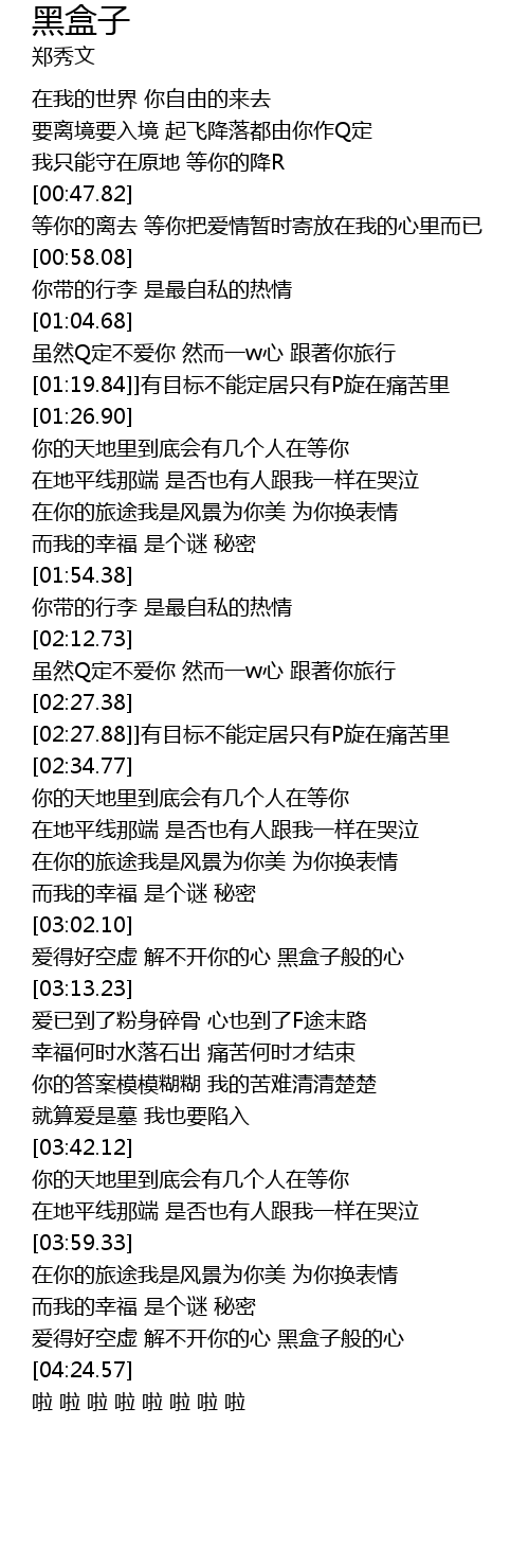 | [04:13.41] | 爱得好空虚 解不开你的心 黑盒子般的心 |