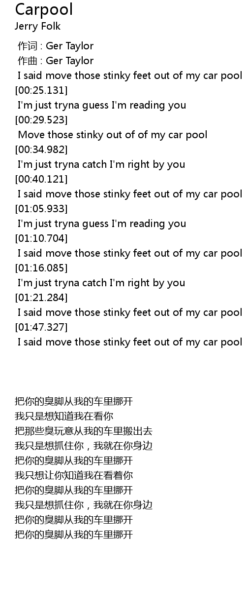 | [01:11.408] | I said move those stinky feet out of my car pool |