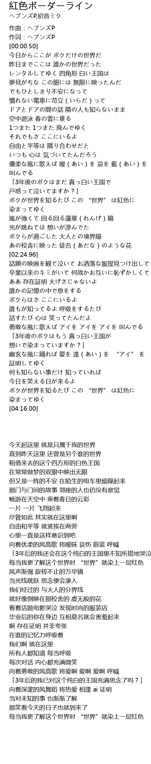 | [04:01.93] | ボクが世界を知るたび この “世界” は紅色に 染まってゆく |