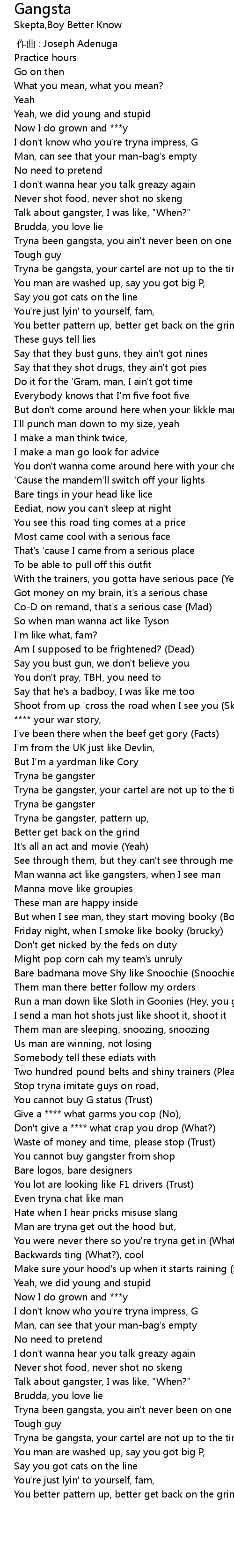 | [01:47.97] | Tryna be gangster, pattern up, |