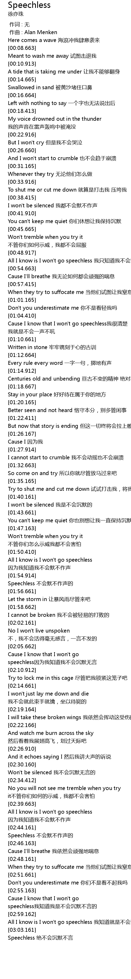 | [03:03.662] | Speechless jué bú huì chén mò bù yán |