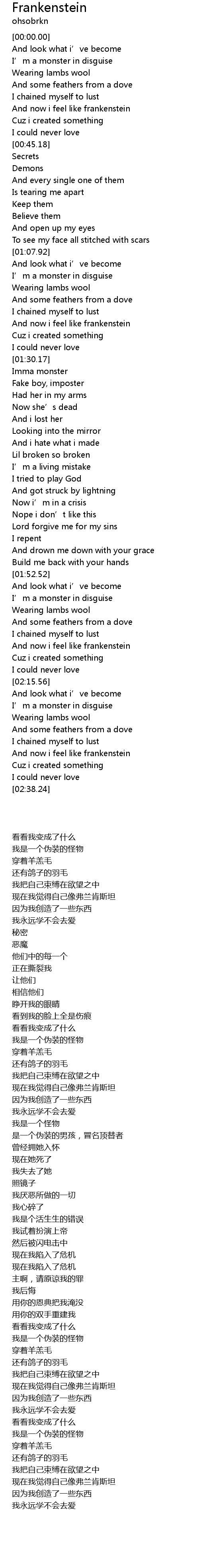 | [00:37.90] | 现在我觉得自己像弗兰肯斯坦 |