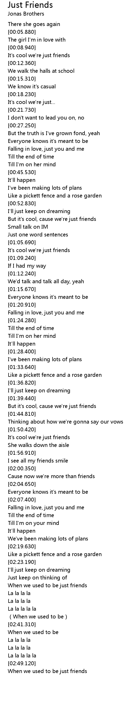 | [00:58.330] | But it' s cool, cause we' re just friends |