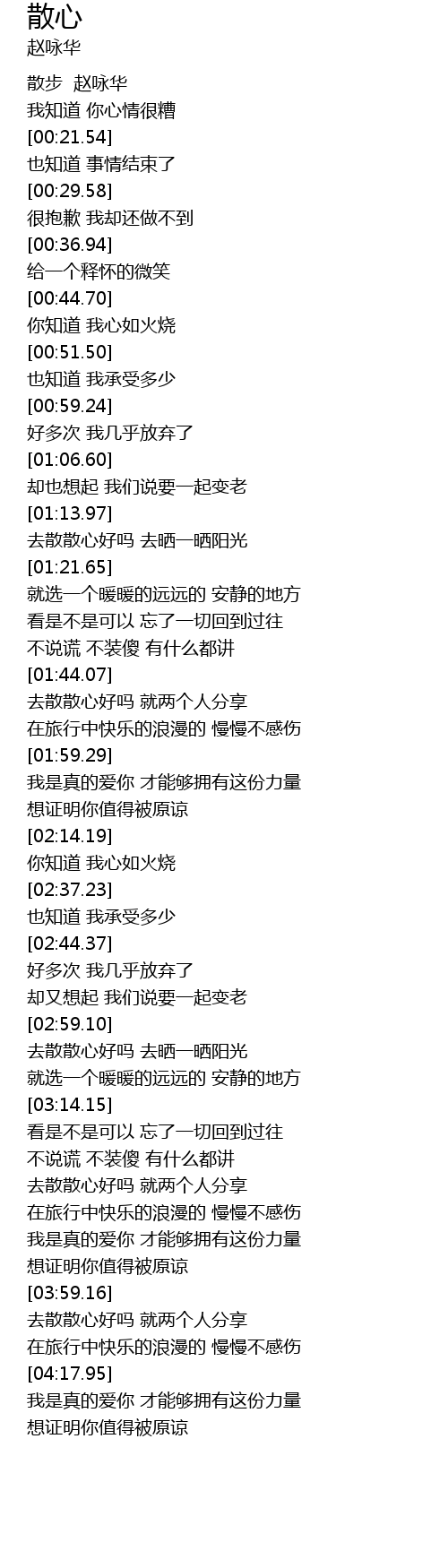| [02:59.65] | qù sàn sàn xīn hǎo ma qù shài yī shài yáng guāng |