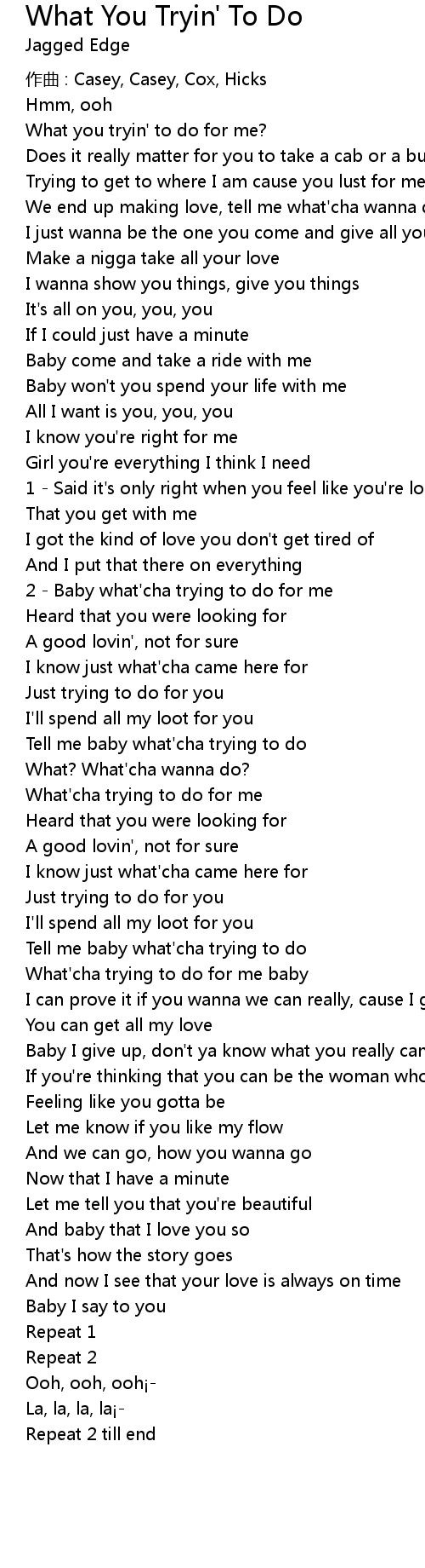| 2 Baby what' cha trying to do for me | |
