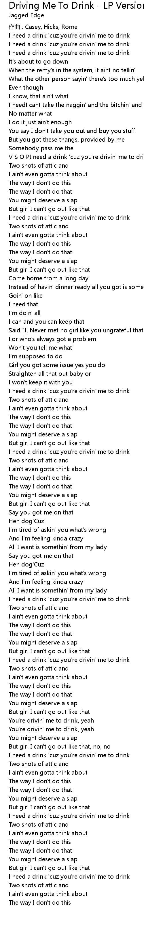 | 歌曲 | Driving Me To Drink - LP Version |
