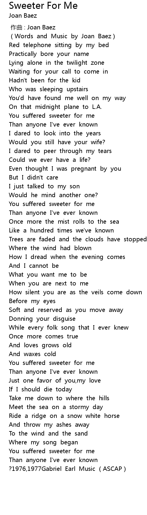 | [00:19.425] | (Words and Music by Joan Baez) |
