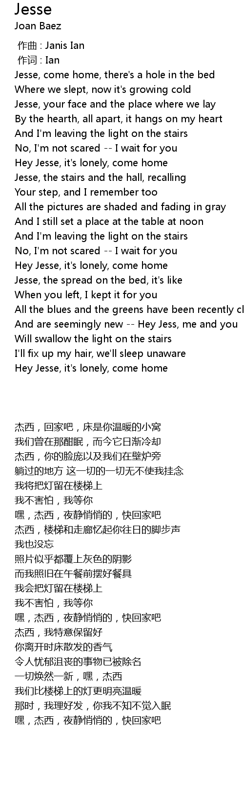 | [01:53.31] | Hey Jesse, it' s lonely, come home |