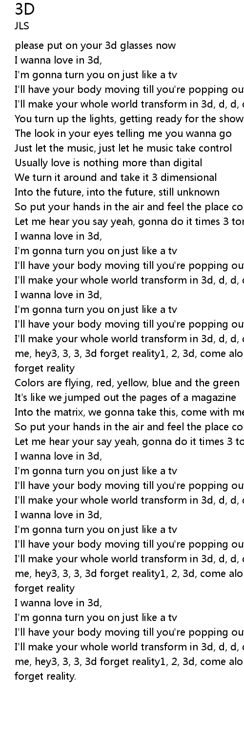 | I'll make your whole world transform in 3d, d, d, d, d1, 2, 3d, come along with me, hey3, 3, 3, 3d forget reality1, 2, 3d, come along with me, hey3, 3, 3, 3d forget reality | |