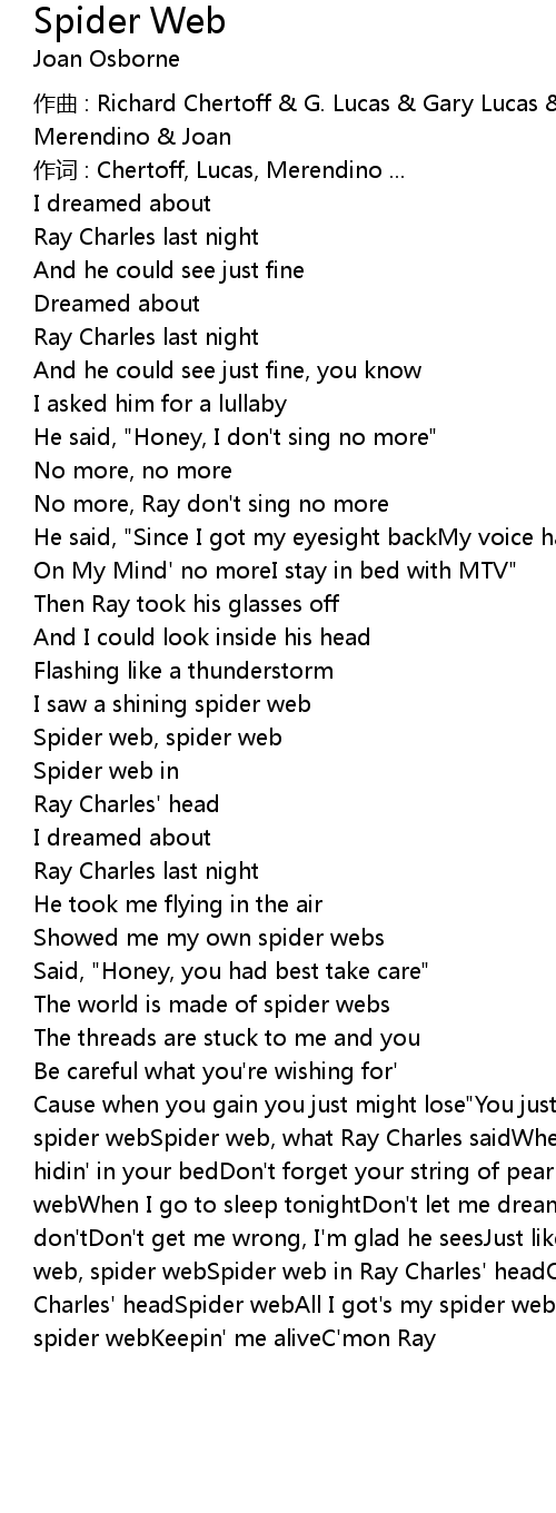 | Cause when you gain you just might lose" You just might lose yourSpider web, spider webSpider web, what Ray Charles saidWhen you' re feelin' lonelyWhen you' re hidin' in your bedDon' t forget your string of pearlsDon' t forget your spider webWhen I go to sleep tonightDon' t let me dream of brother Ray, no, no, no, don' tDon' t get me wrong, I' m glad he seesJust like him best the other waySpider web, spider webSpider web in Ray Charles' headOh spider webSpider web in Ray Charles' headSpider webAll I got' s my spider webKeepin' me aliveAll I got' s my spider webKeepin' me aliveC' mon Ray |