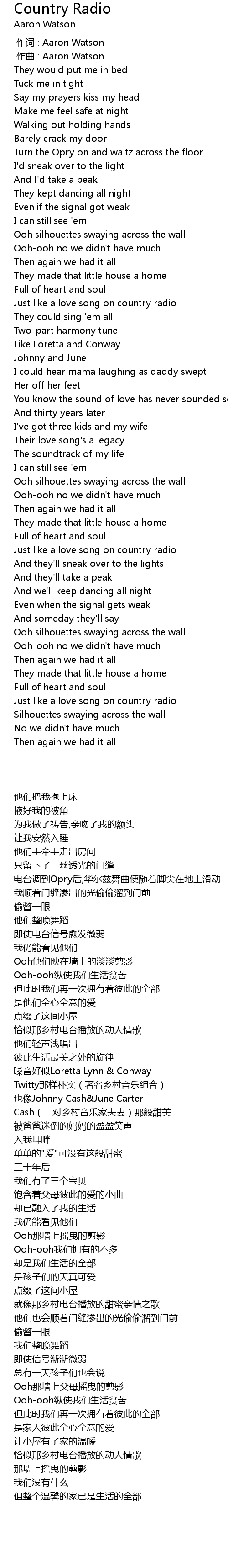 | [00:38.77] | Turn the Opry on and waltz across the floor |