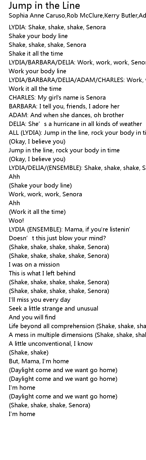 | [00:34.479] | ALL (LYDIA): Jump in the line, rock your body in time |