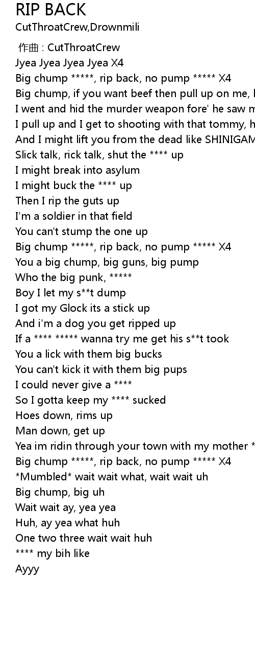 | [01:05.21] | Big chump *****, rip back, no pump ***** X4 |
