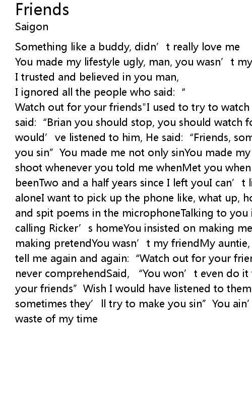 | Watch out for your friends" I used to try to watch for the cops but my pops said:" Brian you should stop, you should watch for your friends" I wish I would' ve listened to him, He said:" Friends, sometimes they' ll try and make you sin" You made me not only sinYou made my temper shorter than NapoleonWould shoot whenever you told me whenMet you when I was only ten, now it' s only beenTwo and a half years since I left youI can' t lie, sometimes when I' m aloneI want to pick up the phone like, what up, holmesInstead, I go in the zone and spit poems in the microphoneTalking to you is something to do, but I be calling Ricker' s homeYou insisted on making me sinYou ain' t love me, you was making pretendYou wasn' t my friendMy auntie, my uncle and themThey used to tell me again and again:" Watch out for your friends" My momma couldn' t never comprehendSaid, " You won' t even do it for me, but you' ll do it for your friends" Wish I would have listened to themThey said: " Friends, sometimes they' ll try to make you sin" You ain' t no friend of mineYou a waste of my time |