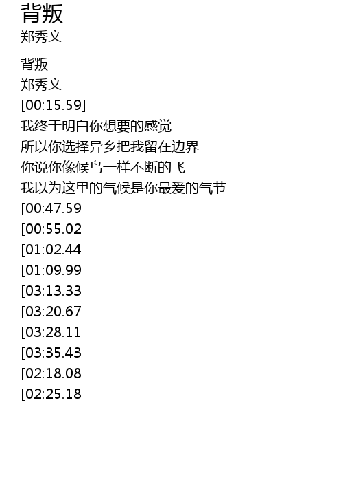 | [02:41.43][00:47.59] | 我后来发现背叛其实没有罪 |