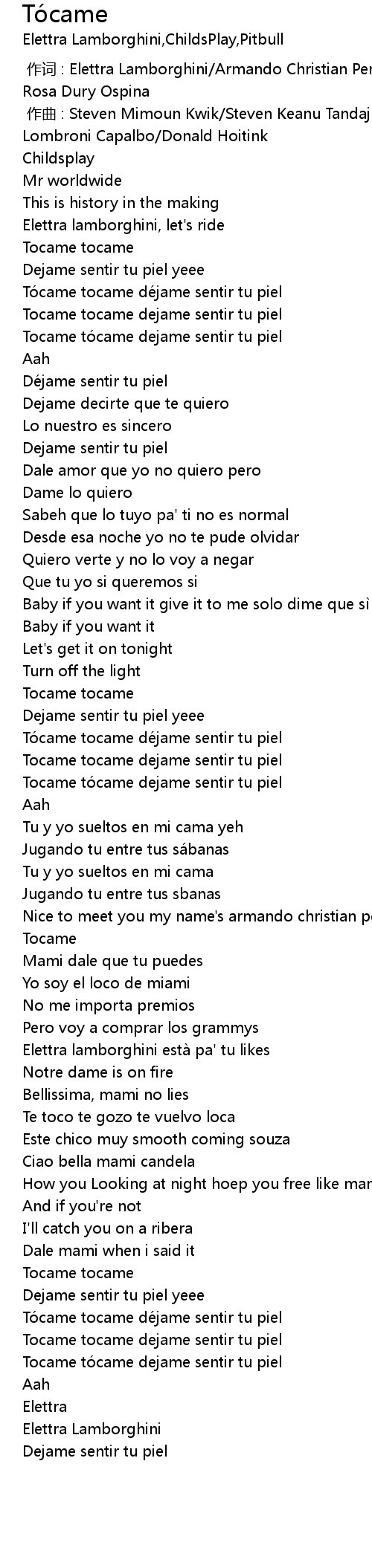 | [02:01.94] | To came tocame de jame sentir tu piel |