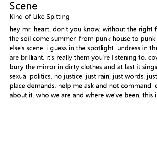 hey mr. heart, don't you know, without the right food to grow you won't break the soil come summer. from punk house to punk house, it's always been somebody else's scene. i guess in the spotlight. undress in the day time. all my friends are brilliant. it's really them you're listening to. cover torso, cover toes. bury the mirror in dirty clothes and at last it sings. something new to believe. sexual politics, no justice. just rain, just words. just us. shouldn't have to place demands. help me ask and not command. oh there we go again, so unsure about it. who we are and where we've been. this is the bad side of tenacity.