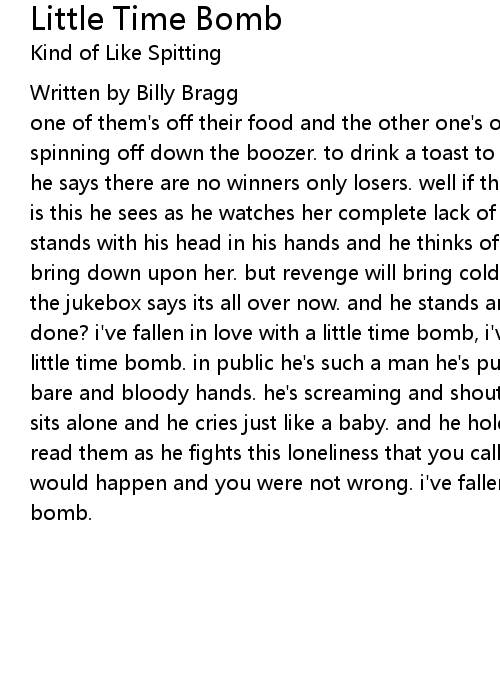 one of them's off their food and the other one's off his head and their both spinning off down the boozer. to drink a toast to the one that he hates most and he says there are no winners only losers. well if there are no winners that what is this he sees as he watches her complete lack of honor? as he sits in the stands with his head in his hands and he thinks of all the things he'd like to bring down upon her. but revenge will bring cold company in this darkest hour as the jukebox says its all over now. and he stands and he screams what have i done? i've fallen in love with a little time bomb, i've fallen in love with a little time bomb. in public he's such a man he's punching at walls, with his bare and bloody hands. he's screaming and shouting, acting crazy but at home he sits alone and he cries just like a baby. and he holds her letters but he can't read them as he fights this loneliness that you call freedom. and you said this would happen and you were not wrong. i've fallen in love with a little time bomb. |