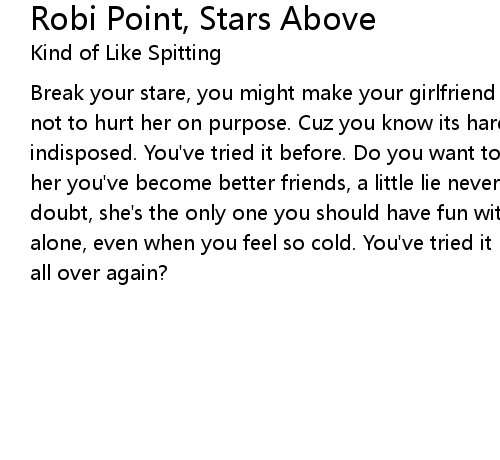 | Break your stare, you might make your girlfriend nervous. Choose your words, try not to hurt her on purpose. Cuz you know its hard to be alone, even when your indisposed. You've tried it before. Do you want to start all over again? Tell her you've become better friends, a little lie never killed anyone. Push out all doubt, she's the only one you should have fun with. Cuz you know its hard to be alone, even when you feel so cold. You've tried it before. Do you want to start all over again? |