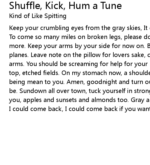 Keep your crumbling eyes from the gray skies, It can only make living a chore. To come so many miles on broken legs, please don't put yourself through any more. Keep your arms by your side for now on. Believe in the powers of jet planes. Leave note on the pillow for lovers sake, cuz no one is safe in these arms. You should be screaming for help for your life. And long walks cross black top, etched fields. On my stomach now, a shoulder. Its not right that I fight being mean to you. Amen, goodnight and turn out the lights. I know where you'll be. Sundown all over town, tuck yourself in strong. Gray and blue striping over you, apples and sunsets and almonds too. Gray and blue on my walk home from you, I could come back, I could come back if you wanted me to. |