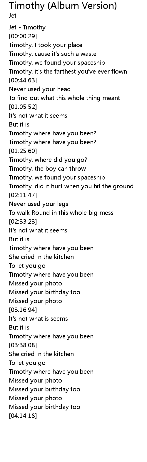 | [02:02.72] | Timothy, did it hurt when you hit the ground |