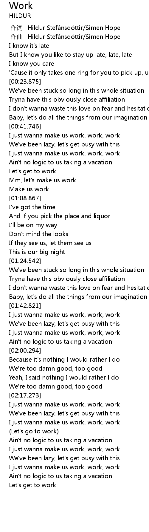 | [00:55.555] | Ain' t no logic to us taking a vacation |