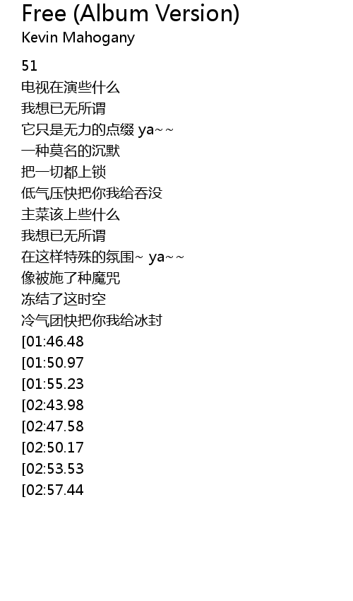 | [02:42.29][01:55.23][00:48.53] | I wanna be free |