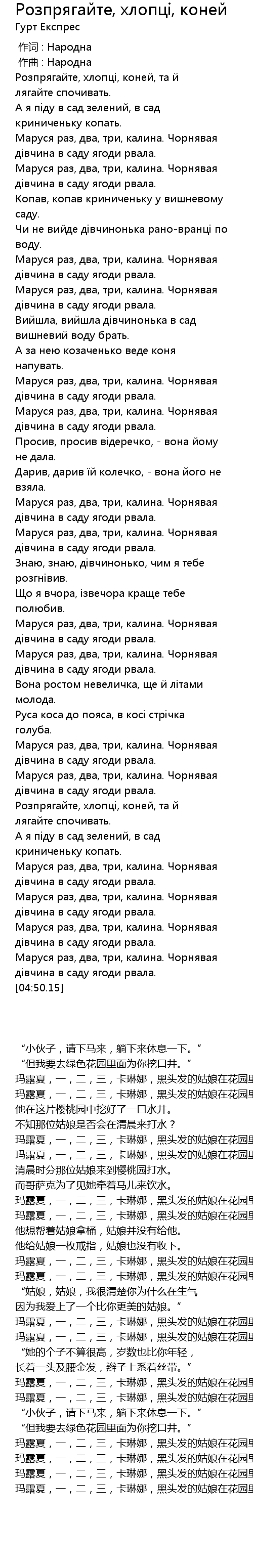 | [04:44.14] | Маруся раз, два, три, калина. Чорнявая дівчина в саду ягоди рвала. |