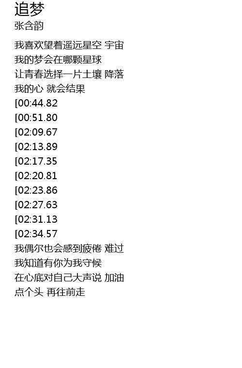 | [03:01.99][02:20.81][01:08.86] | yǒu mèng jiù bù pà jì mò |