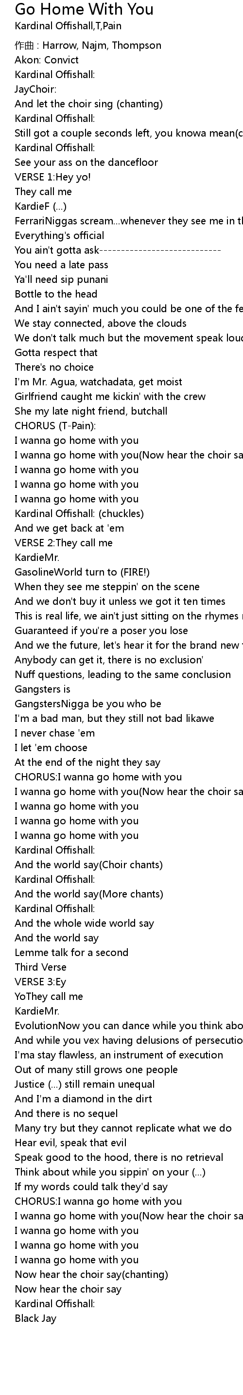 | I wanna go home with you Now hear the choir say | |